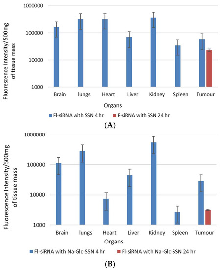 In vivo biodistribution of AF-488–labelled siRNA in nude mice bearing a xenografted 4T1 tumor 4 h and 24 h after intravenous injection of siRNA-loaded nanoparticles; (A). SSNs and (B). Na-Glc-SSNs. Each bar represents the mean ± SEM based on three mice per groups in all cases.
