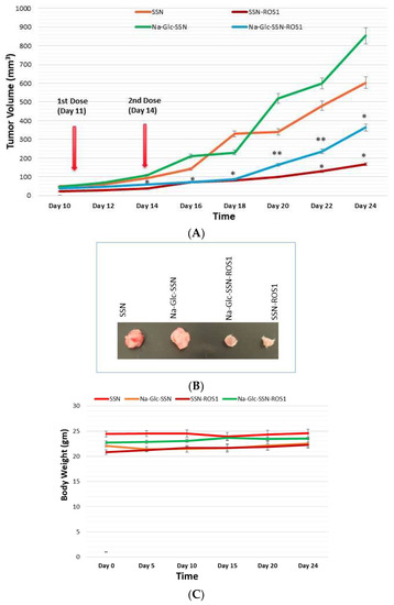 A 4T1-induced murine breast cancer model was used to investigate the effect of SSNs and Na-Glc-SSNs carrying ROS1 siRNA on tumor regression. 50 µL volumes of SSNs-ROS1 and Na-Glc-SSNs-ROS1 prepared with 60 mM SrCl2, 10 mM of Na2SO3 and 50 nM of ROS1 siRNA in the absence and presence of 300 mM of NaCl and 200 mm of d-glucose, respectively, were administered twice within an interval of 3 days through the tail vein, after the tumour volume reached 39 mm3. The results of the tumor growth curve (Figure 17A) show that tumors, following intravenous injections of SSNs and Na-Glc-SSNs, prepared under the same conditions except addition of siRNA, grew quickly almost in the same pattern. In contrast, the tumor growth of the mice treated with SSNs-ROS1 or Na-Glc-SSNs-ROS1 exhibited a relatively slower rate and smaller tumor volumes at the end, suggesting that both SSNs-ROS1 and Na-Glc-SSN-ROS1 effectively reduced the tumor growth in vivo. However, the tumor growth inhibition rate for SSNs-ROS1 was more prominent than Na-Glc-SSN-ROS1 at the later stage, which could be explained by higher renal clearance and lesser tumor accumulation of the latter. None of the two different particle types showed any obvious influence on mouse body weight (Figure 17C), which suggests that siRNA-loaded particles do not have any detrimental systemic toxicity in mice. The notable anti-tumor effects of SSNs and Na-Glc-SSNs carrying ROS1 siRNA indicates that strontium sulfite particles could protect the loaded siRNA against nuclease attack, confer favourable pharmacokinetics, induce no noticeable systemic cytotoxicity, promote excellent tumor uptake and cytosolic release of the siRNA.
