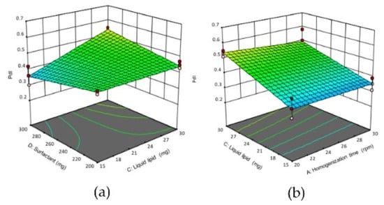 The ZP values of formulations were in the range from −33.2 ± 0.91 to −60.93 ± 1.64 mV (Table 2). The NLCs have the negative charge of ZP due to the ionization of glyceryl behenate moiety (a fatty acid in Compritol 888 ATO®). The homogenization time (A), solid lipid concentration (B) and surfactant concentration (C) showed a significant effect (p < 0.05) on ZP. According to Equation (6), factor A (homogenization time) showed a negative impact on ZP. Thus, prolonging homogenization time would increase ZP value. This could be due to longer homogenization shear force would enhance the ionization of glyceryl behenate. Similarly, factor D (surfactant concentration) also showed a negative impact on ZP. Increasing the surfactant concentration would enhance the emulsification of solid lipid, which led to higher ionization of glyceryl behenate moieties, hence increased ZP value. In contrast, factor B (solid lipid) has the positive impact on ZP, thus increasing the amount of solid lipid would reduce the ZP value, possibly due to incomplete emulsification of solid lipid by the available surfactant. The negative impact of factors AD and DC interactions and the positive impact of BD interactions on the ZP of NLCs are shown in the 3D surface plot (Figure 3). The negative impact of AD interaction (increasing homogenization time and surfactant concentration) or DC interaction (increasing surfactant and liquid lipid concentrations) would result in increasing the negative charge of the particles, hence increased the ZP value of NLCs. The positive effect of BD interaction (increasing solid lipid and surfactant concentration) would decrease the negative charge of nanoparticles thus decreased the ZP value of NLCs.