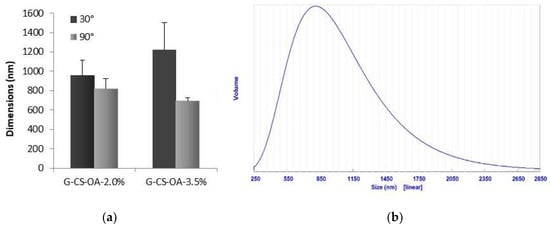 Dimensional characterization of the dispersed phase of geraniol in o/w emulsions. (a) mean values obtained from volume distributions (mean ± S.D., n = 3), (b) example of volume distribution recorded at 90° of detection angle (G-CS-OA-2.0% sample).