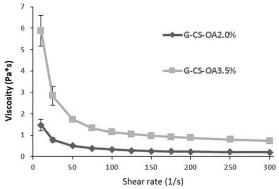 Viscosity curves of the emulsions based on CS-OA-2% and CS-OA-3.5% (w/w) (mean ± S.D., n = 3).