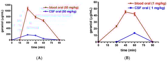 The AUC value obtained for rat blood within 90 min after the oral administration of 50 mg/kg of geraniol formulated as G-CS-OA-2.0% emulsion was 42,713 ± 1553 µg·mL−1 min (Table 1), showing a value significantly higher (p < 0.001) than the AUC value obtained in the CSF (7293 ± 408 µg·mL−1 min, Table 1).