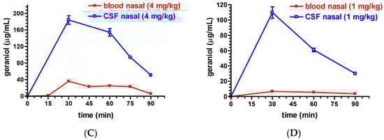 The AUC value obtained for rat blood within 90 min after the nasal administration of 4 mg/kg of geraniol formulated as G-CS-OA-2.0% emulsion was 1668 ± 101 µg⋅mL−1 min (Table 1), showing a value significantly lower (p < 0.001) than the AUC value obtained in the CSF (10,778 ± 477 µg⋅mL−1 min, Table 1).