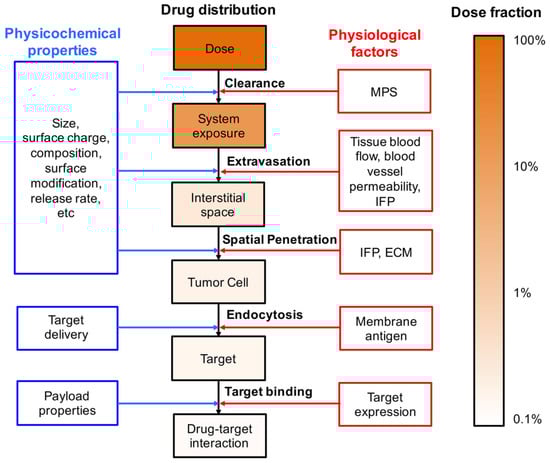 Multiscale physiological barriers to the targeted distribution of liposomal drugs. The dose fraction change was obtained from references [,]. MPS—mononuclear phagocyte system; IFP—interstitial fluid pressure; ECM—extracellular matrix.