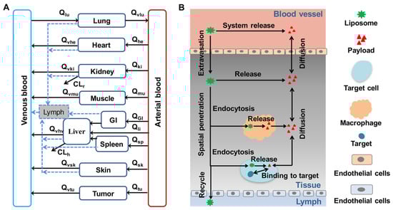 As previously discussed, the multiscale mechanisms of liposomal drug disposition are influenced by numerous physiological factors. Zamboni et al. reported that physiological factors (including age, body composition, monocytes, gender, and liver disease status) shape the disposition of liposomal drugs [,,]. Using a “bottom-up” approach, a general whole-body physiologically-based PK (PBPK) model (Figure 2A) and a mechanism-based model for tumor (Figure 2B) can be proposed to capture the detailed disposition of both liposomes and payload in the biological system. Such PBPK models could be used to investigate the influence of drug-associated factors and physiological factors (such as the MPS) on the multiscale mechanisms of liposomal disposition. Currently, PBPK models are widely used in small molecular drug development and regulatory reviews [,,,,,]. PBPK modeling and simulation has recently emerged as a powerful tool for delineating the PK and tissue distribution profiles of liposomal drugs [,,].