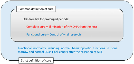 The concepts of human immunodeficiency virus (HIV) cure. A cure for the HIV disease is commonly interpreted as antiretroviral drug therapy (ART)-free life without viral rebound for prolonged periods. In addition, the cure for bone marrow dysfunctionalities observed in HIV-infected patients could be included in a stricter definition of a HIV cure.