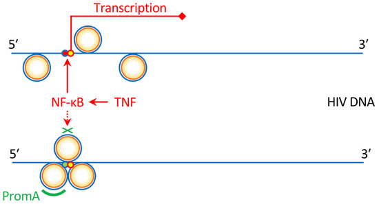 A schematic overview of PromA. PromA induces chromatin compaction in the human immunodeficiency virus (HIV)-1 promoter. This prevents HIV-1 DNA from reactivation, such as NF-κB-mediated reactivation by tissue necrosis factor (TNF). For details on the molecular mechanisms involved in transcriptional gene silencing induced by PromA, see Klemm et al., 2016 [30] and Mendez et al., 2018 [31].