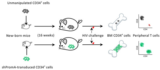 Summary of the humanized mouse study to test the efficacy of shRNA PromA (shPromA) [26]. Newborn NOD/SCID/Jak3null mice were intrahepatically transfused with unmanipulated cord-derived CD34+ cells or CD34+ cells lentivirally transduced with shPromA. Those mice showing engraftment of human cells were challenged with CCR5-tropic HIV-1JRFL. Two weeks after the challenge, the mice were sacrificed and their bone marrow (BM) CD34+ cells and peripheral T cells were analyzed. Interestingly, mice transplanted with unmanipulated CD34+ cells showed unexpectedly low BM CD34+ cell counts 2 weeks after HIV infection, with concomitant depletion of peripheral CD4+ T cells. On the other hand, mice engrafted with shPromA-expressing CD34+ cells showed preserved BM CD34+ cell and peripheral CD4+ T-cell populations at 2 weeks post challenge.
