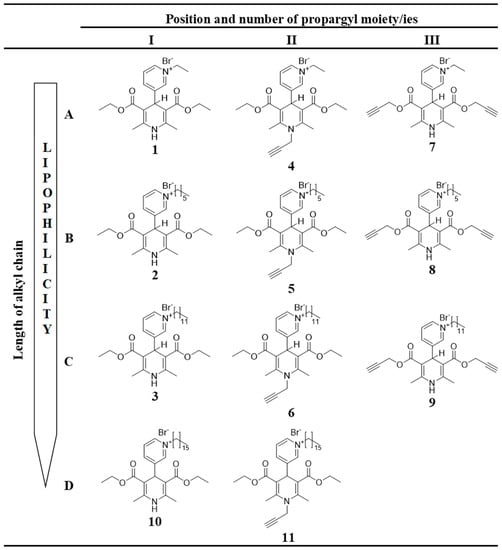 Structures of tested 4-(N-alkylpyridinium)-1,4-DHP derivatives 1–11 with variation of alkyl chain length (A–D) and variation of number and position of propargyl moiety (I–III).