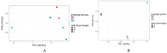 Principal Component Analyses (PCA) data of 4-(N-alkylpyridinium)-1,4-DHP toxicity when analysed by compound boundary concentrations. (A) Full set of compounds, (B) 1,4-DHP 7 omitted. Boundary concentrations from all tested 1,4-DHP derivatives tested in all microorganisms were collected in a score matrix (Table S1 in Supplementary Material); the results formed a four-dimension matrix (number of propargyl groups; side chain length; microorganism; boundary concentration). To find out which of the parameters (number of propargyl groups and/or side chain length) has the most significant impact on the compound’s toxicity, the “artificial” set of variables that would help to visualise the main effects of data variance across a two-dimensional (2D) plot was sought. The data were analysed and visualised by online tool ClustVis [33]. Vector scaling is applied to rows; the Nonlinear Iterative Partial Least Squares (NIPALS) algorithm is used to calculate principal components [42]. The scores of individual compound’s toxicities are plotted using the first two principal components, which explain most of the variance (PC1 63.3% and PC2 19.3% for A, and 39.8% and 24.7% for B). Green triangle: 4-(N-ethylpyridinium)-1,4-DHP 7.