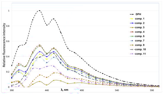 Fluorescence intensity spectra of solutions containing 1,2-dipalmitoyl-sn-glycero-3-phosphocholine (DPPC) (2 × 10−5 M) and 1,6-diphenyl-1,3,5-hexatriene (DPH) (5 × 10−6 M) in the absence or presence of 4-(N-alkylpyridinium)-1,4-dihydropyridines 1–5, 7 and 9–11 (5 × 10−5 M).