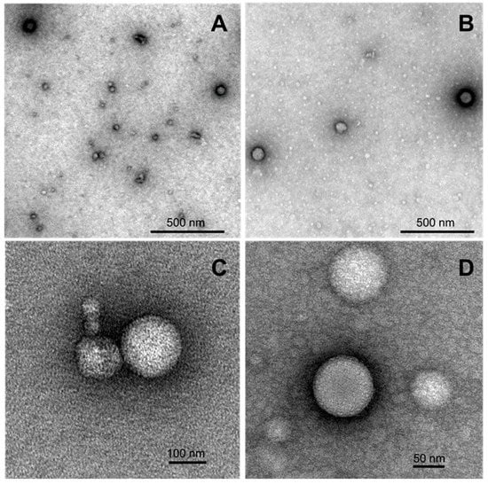 TEM images of formed nanostructures for the samples of 4-(N-dodecylpyridinium)-1,4-DHP 3 (A,C) and 1-propargyl-4-(N-hexadecylpyridinium)-1,4-DHP 11 (B,D) adsorbed to carbon-coated grids and negatively stained with freshly prepared 2% uranyl acetate aqueous solution. The stock samples were prepared by the thin-film hydration method following sonication in an aqueous solution at 1,4-DHP concentrations of 0.5 mM (compound 3) and 0.15 mM (compound 11).
