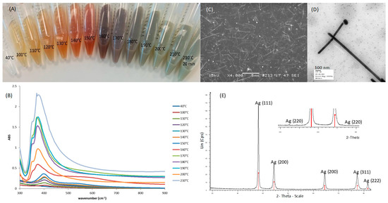 Characterization of silver nanowires-AgNWs: (A) Typical color change of the reaction mixture at different temperatures; (B) the corresponding Ultra Violet spectra; (C) Scanning Electron Microscopy image of AgNWs suspended in a solution of chitosan in lactic acid (scale bar 4 µm); (D) Transmission Electron Microscopy image of AgNWs (scale bar 100 nm); (E) X Ray Diffraction pattern of the synthesized AgNWs (red bars: Ag, PDF No. 04-0783; blue bars: AgCl, PDF No. 31-1238).
