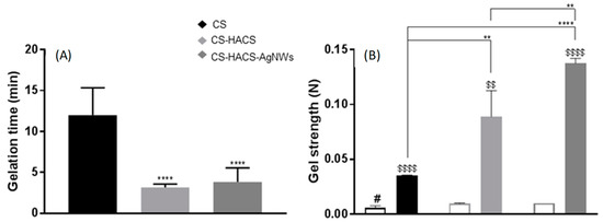 Physical characterization of the hydrogels: Chitosan (CS, black), chitosan gel with chitosan hydroxyapatite composite (CS-HACS, light grey) and chitosan gel with chitosan hydroxyapatite composite and silver nanowires (CS-HACS-AgNWs, dark grey). (A) Gelation time calculated by the inverted tube method. Data are reported as mean ± SD (n = 9). One-way Analysis of Variance (ANOVA) returned p < 0.0001. Post-hoc Tukey’s comparison test results are shown in the graph: **** indicates p < 0.0001 as compared to the control (CS); (B) Gel strength calculated by texture analysis before (empty bars) and after (filled bars) gelation. Data are represented as mean ± SD (n = 3). The t-test performed on all samples before and after gelation showed significantly different strength values for all gels ($$ indicates p < 0.01 and $$$$ p < 0.0001). One-way ANOVA to compare the different formulations returned p < 0.01 before and p < 0.0001 after gelation. Post-hoc Tukey’s test results showed that before gelation only CS is different from all other gels (# p < 0.05), while the individual results for after gelation are reported on the graph (** p < 0.01; **** p < 0.0001).