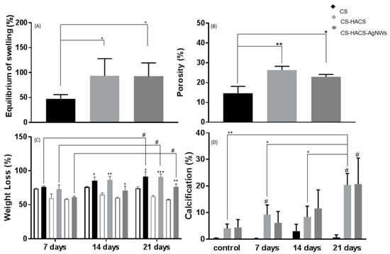 Further physical characterization, enzymatic degradation and bioactivity determination of hydrogels: CS (black), CS-HACS (light grey) and CS-HACS-AgNWs (dark grey). (A) Equilibrium swelling (Q%), data are reported as mean ± SD (n = 6). One-way ANOVA returned p < 0.05, results of the post-hoc Tukey’s multi-comparison test are reported in the graph (* p < 0.05); (B) Gels porosity determined by gravimetric method, data are reported as mean ± SD (n = 3). One-way ANOVA returned p < 0.05, results of the post-hoc Tukey’s multi-comparison test are reported in the graph, (* p < 0.05 and ** p < 0.01); (C) Gels degradation in the presence of lysozyme (full bars), the empty bars represent the relative control gels treated in PBS; data are reported as mean ± SD (n = 3). One-way ANOVA returned p < 0.05, results of the post-hoc Tukey’s multi-comparison test are reported in the graph (# p < 0.05). A t-test was performed against the PBS incubated samples for each gel at each time point; * p < 0.05, ** p < 0.01 and *** p < 0.01; (D) Percentage surface calcification of hydrogels incubated at 37°C in SBF for 7, 14 and 21 days as calculated by image analysis via ImageJ and BoneJ from SEM images. Controls were only incubated for few hours in deionized water. Results are reported as mean ± SD (n = 3). Samples labeled with the symbol # resulted to be significantly different from their control sample (p < 0.05). One-way ANOVA returned p < 0.05 only when testing CS-HACS at different time points, the results of the post-hoc Tukey’s multi-comparison test are reported in the graph (* p < 0.05, ** p < 0.01).