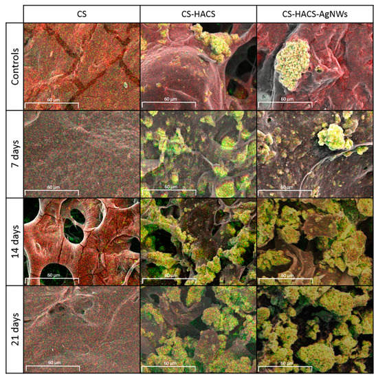 Energy-dispersive X-rays spectroscopy (EDS) coupled SEM images (1000× magnification) of CS, CS-HACS and CS-HACS-AgNWs hydrogels incubated in SBF for 7, 14 and 21 days. Control samples were incubated in water for 5 h. Images show an overlay of SEM pictures with EDS data: Ca (green), P (red) and co-localisation of Ca/P (yellow).