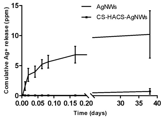 AAS was used to determine the total Ag+ released from AgNWs and CS-HACS-AgNWs scaffolds. Silver release was studied over a period of 38 days, using ultrapure water as medium. Both materials showed silver release in water (Figure 5), with a faster release at the beginning and a slow sustained release over time. After 38 days, approximately 11 ppm of Ag+ were released from AgNWs, while nearly 1 ppm was released from the hydrogels.