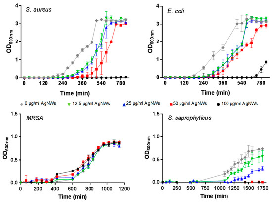 Growth curves of different bacteria in suspension in the presence of 0 (grey), 12.5 (green), 25 (blue), 50 (red) and 100 (black) µg/mL of AgNWs.