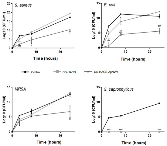 Growth of S. aureus, E. coli, MRSA and S. saprophyticus in suspensions containing CS-HACS (light grey), CS-HACS-AgNWs (dark grey) and LB only (black). Results are reported as mean ± SD. One-way ANOVA was performed between different samples, when significant a Tukey’s post-hoc multicomparison test was performed, results are reported on the graph. * represents the statistical difference between scaffolds and bacterial suspensions (* p < 0.05, ** p < 0.01; *** p < 0.001 and **** p < 0.0001) while # represents the statistical difference between CS-HACS and CS-HACS-AgNWs scaffolds (# p < 0.05, ## p < 0.01; ### p < 0.001 and #### p < 0.0001).