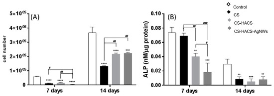 The biocompatibility of the hydrogels was verified by determining the growth of MC3T3-E1 cells through the adenosine triphosphate (ATP) assay, a well-known reproducible and reliable assay of cell viability (Figure 8A) [29]. The cells responded well to all the hydrogels with an increase in cell number, although they did not proliferate as well as the cells seeded on tissue culture polystyrene plates, taken as control cultures. A significant enhancement of cell growth was detected in HACS containing hydrogels, as shown by the increase in cell number at both days 7 and 14. Although the HACS did not allow the cells to proliferate as well as in the control, it supported cell growth better than the hydrogels containing CS only. At 14 days, no significant difference between the CS-HACS and the CS-HACS-AgNWs was detected. Furthermore, the differentiation of the pre-osteoblast MC3T3-E1 cells was determined in order to evaluate the potential of the hydrogels to support osteoblast differentiation for bone repair. The alkaline phosphatase (ALP) assay was performed as ALP activity is considered to be an early biochemical marker for osteoblast differentiation and an indicator of bone tissue formation [30]. The MC3T3-E1 cells began to differentiate into osteoblasts in all the samples, as confirmed by the presence of ALP activity after seven days in culture (Figure 8B). ALP activity was higher in the control and CS samples than in the other hydrogels. The statistical analysis revealed that there was no statistical difference between the control and CS samples at seven days. With the addition of the hydroxyapatite a decrease in ALP was observed at day 7 while after 14 days no difference between CS and CS-HACS gels was detected. At day 14, a decrease in enzyme activity was visible in all cultures; this is expected as the highest concentration of ALP is expressed during the early stages of bone formation [31].