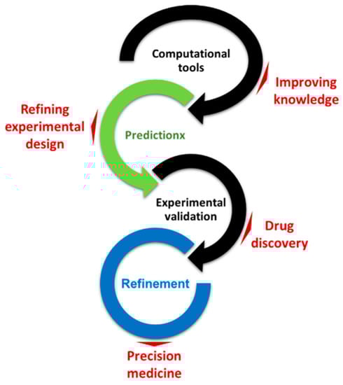 Experimental and computational cancer-based models have provided an invaluable alternative to direct investigations on patients, allowing to overcome experimental design, ethical, economic and welfare issues. However, these models often fail to describe the full complexity of cancer, and in the translational process between preclinical results and clinical scenarios []. In spite of this, they have allowed to (1) explain important phenomena associated to intracellular signaling and the respective activation by the pre-selected therapeutic agents, (2) establish a direct connection between intracellular signals and cell behaviors, and (3) simulate the behavior of pathological tissues, predicting the systemic response of the underlying entities []. The resulting outcomes can be correlated and validated with in vivo studies and used to improve and fine-tune the models and facilitate predictive-oriented experimental designs (see Figure 1). In turn, data obtained from in vivo studies are used to develop and optimize computational approaches, which are then used as predictive tools to provide new insights on the systems under scrutiny.