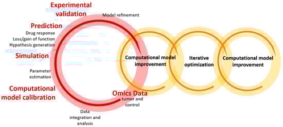 The optimization and validation of computational models can be conducted imposing different conditions and introducing the parameter and response information in experimental systems using an iterative and flexible scheme, illustrated in Figure 2. The latter enables the identification of relevant parameters, increasing the predictive accuracy of the model and providing the mechanistic details underlying cancer processes and drug action. In simple terms, this iterative procedure involves the integration of omics data (e.g., transcriptome) obtained from experimental samples (e.g., tumor and control samples from patient-derived xenografting, transgenic mice, or organotypic/tumor cell cultures), into a signaling model, which is subsequently trained by these experimental data. The effect of the imposed conditions is simulated using the model parameters, and the expected values are used to validate the resulting predictions in experimental models (see [,,] for details).