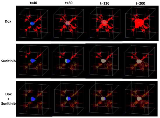 Zhou et al. [] designed a multi-scale agent-based model considering the angiogenesis and tumor growth to evaluate the tumor response to a treatment with combined drugs (doxorubicin and sunitinib). The time evolution of the tumor under the treatment with single and combined drugs is presented in Figure 3. For describing this growth process, which has been recognized as a key factor for melanoma’s initiation, progression, and response to treatment, the model integrated the tumor cell and the endothelia cell as two different agents for mimicking, respectively, the tumor progression and vasculature. The multi-scale nature of this model refers to the intra-/intercellular and tissue levels, which describe, respectively, the basic mechanism underlying the phenotypic switch of tumor cells, the connection between tissue and intracellular scales, and the spread of blood vessels through the migration of endothelial cells. It was demonstrated that the role of the tumor angiogenesis interactions in melanoma was successfully described by the model []. It was also suggested that the drug-treatment efficacy can be enhanced by interrupting the communications between tumor cells and vasculatures [].