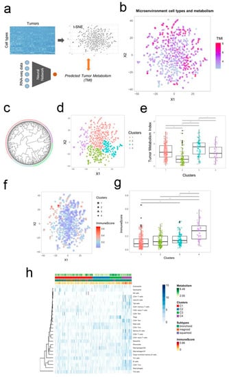 More recently, Na and Choi [] have designed a transcriptome-based tumor metabolism estimation model, using RNA sequencing and image data. This model allowed for estimating cell type enrichment scores and the overall immune cell enrichment. The groups formed based on the cellular heterogeneity in the tumor microenvironment (Figure 4a–e) were further characterized using data from tumor glucose metabolism and immune cell composition (Figure 4f–g).
