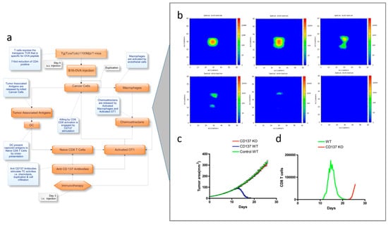 (a) Scheme of the modelling workflow, (b) Simulation dynamics results of the tumor growth in a virtual mouse after treatment with OT-1 T-cells and anti-CD137 monoclonal antibody, obtained at days 7, 41, 16, 20, 24, and 28 (from upper-left to lower-right). The effect of anti-CD137 in tumor infiltration is confirmed by the increased TC cell cytotoxicity and by the chemotaxis gradients. (c,d) Model prediction results obtained from the in silico study suggesting that the combined therapy with OT-1 T-cells and anti-CD137 monoclonal antibody) was not efficient in eliminating murine B16OVA melanoma with no expression of CD137 on endothelium (c). When comparing with wild-type in silico mice, the CD8 T cell infiltration was drastically reduced and delayed in time (d). Adapted from [] under a CC BY 4.0 License. Copyright Pappalardo, F., Forero, I.M., Pennisi, M., Palazon, A., Melero, I. and Motta S., 2011.