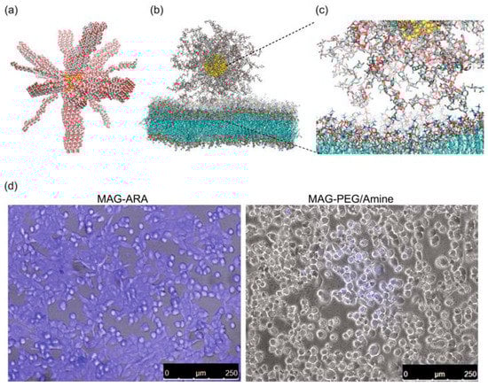 Membrane interaction and internalization of the polyarabic-coated magnetite nanoparticle, MAG-ARA. (a) Initial configuration of MAR-ARA in vacuum. (b) Final configuration of MAR-ARA in contact with a dipalmitoyl phosphatidylcholine (DPPC) bilayer. (c) Example of the interactions of l-arabinose and d-galactose with DPPC. (d) Confocal fluorescence image and a bright filed image from human breast cancer cells incubated with MAG-ARA, left, and control nanoparticles, right. Reprinted from [] under a CC BY 4.0 license. Copyright Patitsa, M., Karathanou, K., Kanaki, Z., Tzioga, L., Pippa, N., Demetzos, C., Verganelakis, D.A., Cournia, Z. and Klinakis, A., 2017.