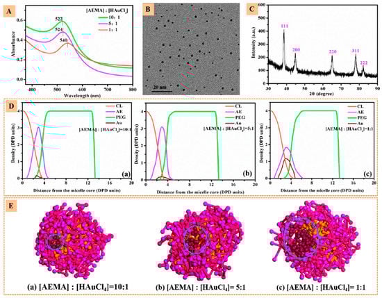(A) UV−vis absorption spectra of β-CD-(PCL-PAEMA-PPEGMA)21/AuNPs at different (AEMA):(HAuCl4) molar ratios. (B) Transmission Electron Microscopy (TEM) image and (C) XRD plot of β-CD-(PCL-PAEMA-PPEGMA)21/AuNPs at (AEMA):(HAuCl4) molar ratio of 5. (D) Density profiles of different beads and (E) cross-section views of β-CD-(PCL-PAEMA-PPEGMA)21/AuNPs at different (AEMA):(HAuCl4) molar ratios. Reprinted with permission from []. Copyright American Chemical Society, 2017.