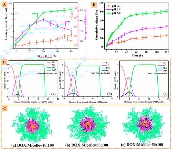 Resorting to dissipative particle dynamics simulations with coarse-grained models, the microstructure of the micelles and the preferential location of the nanoparticles and drug molecules on the micelles were enlightened. The nanoparticles and the drug molecule were preferentially located in the PAEMA region, while at higher concentrations DOX penetrated the inner PCL core (see Figure 7 and Figure 8).