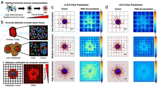 (a,b) Illustrative description of the strategy used for detecting liver metastatic colorectal tumors using halofluorochromic polymer nanoassemblies (PNAs) and computational simulations. (c,d) Simulation results reflecting the distribution of the nanoparticles in metastatic tumors at (c) 1.8 h and (d) 12 h, after systemic injection of the nanoparticles for three different degrees of vascularization. Red refers to viable tumor tissue, blue reflects enclosing hypoxic tissue, and brown reflects necrotic regions. The rectangular grid represents the capillary network, displaying irregular sprouts, which simulate the angiogenesis effect and the growth of blood vessel. Reprinted with permission from []. Copyright Springer Nature, 2017.