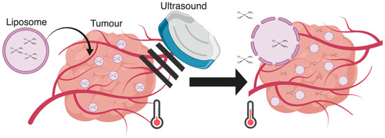 Pioneers of TSLs, Yatvin et al., explored temperature-sensitive liposomes in the 1970s which were composed of 1,2-dipalmitoyl-sn-glycerophosphocholine (DPPC, Tm = 41.5 °C) and 1,2-distearoyl-sn-glycerophosphocholine (DSPC, Tm = 54.9 °C) for temperature-induced neomycin release in E. coli. Initially, work in temperature-sensitive liposomes displayed relatively slow drug release kinetics [11]. Despite this limitation, the DPPC DSPC TSL liposomes were tested in an in vivo subcutaneous Lewis lung tumor model where an implanted thermocouple maintained the temperature of the tumor at 42 °C. Although the authors were able to achieve a higher concentration of methotrexate (MTX) at the tumor site, confounding variables, such as increased blood flow and increased endothelial permeability, which occur due to continuous heating, made it unclear whether the increased MTX concentrations were due to the increased liposome accumulation at the site of the tumor or the increased liposomal drug release [14]. This study prompted further investigations of TSLs, such as improving the liposome’s drug release kinetics as well as identifying a method that could heat the tumor rapidly and locally. Since then, the original thermo-sensitive liposome formulations by Yatvin have been modified to improve drug release. This was mainly achieved through the alteration of the liposome’s lipid composition, such as including lysophospholipids, but the same has also been demonstrated through other methods, such as incorporating leucine-zippers to the membrane of the liposomes [12,15]. TSLs were later used with US induced heating to trigger drug release, as depicted in Figure 1, in the 1980s by Tracker and Anderson. It was then that the potential of using US to induce drug release in TSLs was first recognized due to the astounding 12-fold increase of drug accumulation at the site of interest under rapid, local US heating [16].