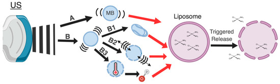 Schematic of the mechanisms associated with US that can be used to mechanically destabilize liposomes. The mechanisms are as follows: (A) US induced stable cavitation of a MB (B) US induced inertial cavitation of a MB; (B1) The production of a liquid microjets from a MB undergoing inertial cavitation; (B2) The production of shockwaves from a MB undergoing inertial cavitation; (B3) A MB collapsing and undergoing sonochemical changes.