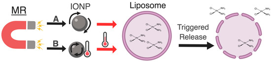 The heat generated by magnetic nanoparticles (MNPs) upon application of AMFs has been used to raise the bulk temperatures of malignant tissue to lethal limits in a process called magnetic hyperthermia [129]. The bulk heating of tissue with magnetic hyperthermia has also been used to release drug from nano-composites, liposomes, polymers lipid structures, or cyclodextrin conjugated to MNPs [130,131,132,133,134,135,136,137]. In the following section of the review, the use of MFs to disrupt liposomes associated with MNPs, by either inducing heat or by mechanical motion to cause the release of their payload, will be discussed (Figure 3).