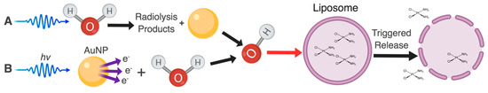 Schematic of the mechanisms associated with RT that can be used to destabilize liposomes. The mechanisms are as follows: (A) The interaction of radiation with water to produce radiolysis products that can interact with AuNPs to amplify hydroxy radical production. These radicals can then destabilize liposome bilayers for triggered drug release; (B) The interaction of radiation with AuNPs to produce secondary electrons (such as Compton scattering and Auger electrons) which can then interact with water to produce hydroxy radicals. These radicals can then destabilize liposome bilayers for triggered drug release.