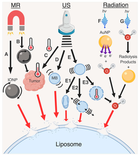 Schematic of the mechanisms associated with MR, US, and RT that can be used to destabilize liposomes. The mechanisms are as follows: (A) MR induced mechanical disruption; (B) MR induced hyperthermia; (C) US induced hyperthermia; (D) US induced stable cavitation of a MB; (E) US induced inertial cavitation of a MB; (E1) The production of a liquid microjets from a MB undergoing inertial cavitation; (E2) The production of shockwaves from a MB undergoing inertial cavitation; (E3) A MB collapsing and undergoing sonochemical changes; (F,G) The interaction of radiation with AuNPs and water to produce hydroxyl radicals that destabilize liposome bilayers.