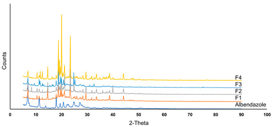 X-ray diffractogram of albendazole and albendazole self-microemulsifying chewable tablets formulation F1–F4.