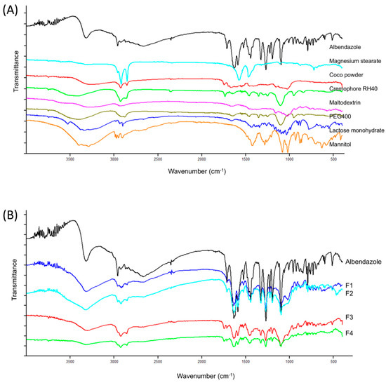 Fourier transfrom infrared (FT-IR) spectrum of (A) albendazole and excipients used in the formulation (B) albendazole and albendazole SMEDDS chewable tablets formulation F1–F4.