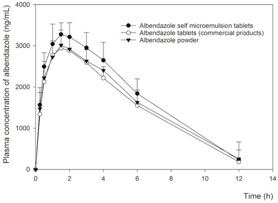 Figure 9 shows the change in the mean plasma concentration of albendazole after the oral administration of the F2 albendazole self-microemulsion chewable tablet, albendazole commercial chewable tablets, and albendazole powder, at a dose of 50 mg/kg albendazole, in rats. The albendazole commercial tablets and powder yielded a lower total plasma concentration compared to the F2 chewable tablet formulation. One to 12 h after dosing, plasma concentrations of both the commercial tablets and albendazole powder were significantly lower compared with the F2 chewable tablet (p < 0.05), likely due to their lower drug solubility and dissolution. Some studies indicate that relatively higher plasma concentrations of albendazole with SMEDDS were due to the increase in solubility and dissolution of albendazole from this system [4,13]. The pharmacokinetic parameters are shown in Table 6. The albendazole SMEDDS formulations showed significantly higher AUC and Cmax compared to the commercial tablets and albendazole powder (p-value < 0.05) but the AUC and Cmax of the commercial tablets and albendazole powder showed bioequivalent (p-value > 0.05). In particular, the AUC values of albendazole SMEDDS were about 1.3-fold higher than that of the albendazole powder. However, AUC did not differ between albendazole commercial tablets and albendazole powder. Although Cmax values were about 1.2 fold higher as compared to the corresponding values for albendazole powder, Tmax and t1/2 values of both formulations were not significantly different from the commercial powder. Our results suggest that the enhanced oral bioavailability of albendazole in the SMEDDS formulation led to a marked increase in drug absorption due to its improved solubility and dissolution, supporting the hypothesis illustrated in Figure 1.