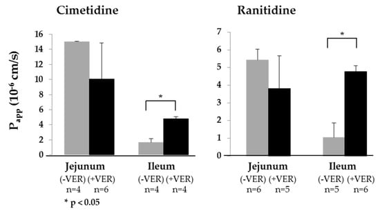 - Collett, A.; Higgs, N.B.; Sims, M.; Rowland, M.; Warhurst, G. Modulation of the permeability of H2 receptor antagonists cimetidine and ranitidine by p-glycoprotein in rat intestine and the human colonic cell line Caco-2. J. Pharmacol. Exp. Ther. 1999, 288, 171–178. [Google Scholar] [PubMed]