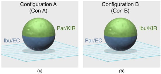 All the powders were sieved using a 150 μm sieve prior to their use to permit a better flow of the powder particles in the chamber, resulting in a better printing procedure [33]. For all the formulations, 100 g of a mixture of drug and excipients were blended using a mortar and pestle (Table 1). 3% Candurin Gold Sheen was added to the formulations to enhance energy absorption from the laser and aid printability. The single miniprintlets were loaded with 5% paracetamol, whereas the dual miniprintlets contained 6.5% paracetamol and 3.5% ibuprofen, which is the ratio at which combinations containing these drugs tend to be at. Powder mixtures were transferred to a desktop SLS printer (Sintratec Kit, AG, Brugg, Switzerland) to fabricate the oral dosage formulations. 123D Design (Version 14.2.2, Autodesk Inc., San Rafael, CA, USA) was used to design the templates of the spherical miniprintlets (1 mm and 2 mm in diameter). The 3D models were exported as a stereolithography (.stl) file into the 3D printer Sintratec central software (Version 1.1.13, Sintratec, AG, Brugg, Switzerland). The dual miniprintlets consisted of two distinct regions, wherein the one region had immediate release properties and the other region exhibited sustained release (Figure 1). As such, to prevent the mixing of the two powders and permit precise control over the content of each region, the reservoir platform was kept empty and instead, the powders were manually added to the building platform before the start of each layer. From our observation, the manual addition of the powder slightly lengthened the printing process, as the freshly added layer required additional heating prior to the start of the printing. The dual miniprintlets were fabricated in two different configurations; in configuration A (Con A), paracetamol was mixed with Kollicoat IR (Par/KIR region) and ibuprofen was with ethyl cellulose (Ibu/EC region). Comparatively, in configuration B (Con B), the positions of the drugs were switched and paracetamol was mixed with ethyl cellulose (Par/EC region), whilst ibuprofen was with Kollicoat IR (Ibu/KIR region).