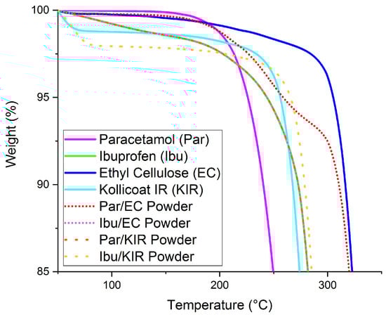 For thermogravimetric analysis (TGA), average samples of 8–10 mg of raw drugs, polymers and powder mixtures were heated at a temperature range of 50 °C to 500 °C and a heating rate of 10 °C/min in open aluminium pans using a Discovery TGA (TA instruments—Waters LLC, New Castle, DE, USA). Nitrogen, at a flow rate of 25 mL/min, was used as a purge gas. Data were collected and analysed using TA Instruments Trios software (Version 4.5.0.5), where the percentage mass loss with respect to temperature was calculated.
