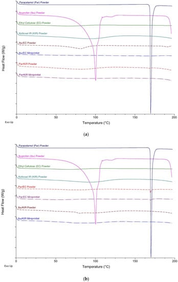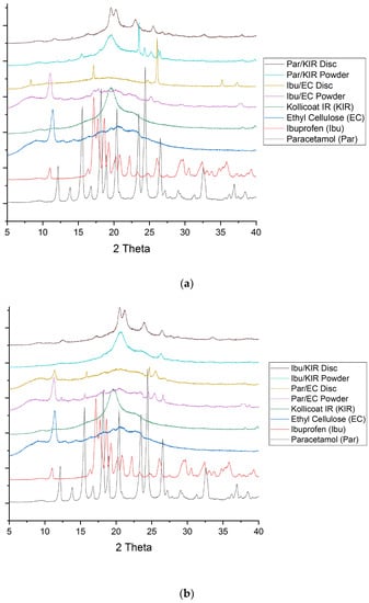 DSC and XRPD analysis of the drug, polymers and powder mixtures prior to printing, and of the miniprintlets, were performed to determine the physical state of the drugs and the degree of their incorporation within the polymers (Figure 3 and Figure 4). Before printing, the DSC data showed that the raw paracetamol powder exhibited a melting endotherm at approximately 168 °C, indicative of form I [41]. The raw ibuprofen powder exhibited a broad endotherm at 100 °C, indicative of dehydration, and a sharp melting endotherm at approximately 200 °C, indicative of a racemic conglomerate, which melts at 199 °C [42]. The DSC data of the Par/EC miniprintlets showed a small melting endotherm at approximately 168 °C, demonstrating that paracetamol still exists in its crystalline form. The Par/KIR, Ibu/EC and Ibu/KIR miniprintlets, on the other hand, showed no evidence of melting endotherms, indicating that the drugs are either molecularly dispersed within the polymers or dissolved within the polymers as the temperature increases during the DSC process. Corroborating with the results obtained by DSC, the X-ray diffractograms of the Par/EC discs demonstrated that paracetamol was partially crystalline in the miniprintlets (Figure 4b). For Par/KIR, paracetamol showed less crystalline peaks in the printed discs, indicating that it had been converted to an amorphous state (Figure 4a). Interestingly, the Par/KIR and Ibu/KIR discs showed an increase in crystalline peaks, attributed to Kollicoat IR, which could be due to its exposure to heat during the sintering process [43].