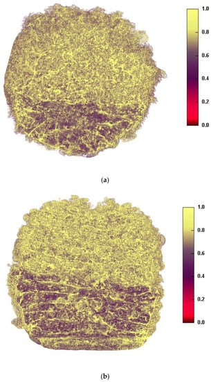 A high-resolution X-ray micro computed tomography (Micro-CT) scanner (SkyScan1172, Bruker-microCT, Kontich, Belgium) was used to three-dimensionally visualise the internal structure and calculate the density of the miniprintlets. In this study, 2 mm dual miniprintlets were scanned with a resolution of 2000 × 1048 pixels. 3D imaging was performed by rotating the object through 180° with steps of 0.4° and four images were recorded for each of those. Image reconstruction was performed using NRecon software (Version 1.7.0.4, Bruker-microCT) and 3D model rendering and viewing were performed using the associate program CT-Volume software (Version 2.3.2.0). The collected data were analysed using Analyzer (Version 1.16.4.1), where maps of different colours were used to represent the density of the miniprintlets.