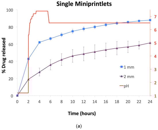 Drug dissolution profiles from the miniprintlets were obtained using a dynamic in vitro model, which simulates gastric and intestinal conditions of the gastrointestinal tract (Figure 7) [44]. Despite their larger surface area compared with large monolithic systems, all of the single miniprintlets exhibited sustained and slow paracetamol release, with a drug release of 88% and 61% from the 1 mm and 2 mm miniprintlets, respectively, after 24 h (Figure 7a). As expected, the drug release rate from the miniprintlets was reduced when increasing the diameter. In a previous study, ethyl cellulose has shown very slow release, where only 20% paracetamol was released after 24 h from cylindrical printlets [26]. As such, this shows that the miniprintlets are more suited as a drug delivery platform for SLS printing using ethyl cellulose as the main polymer matrix. Indeed, this can be correlated to the increased surface area resulting from the reduction in diameter of the respective miniprintlets.