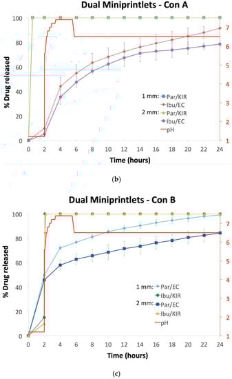 In the dual miniprintlets incorporating two drugs, interestingly, the release profile of paracetamol from the Par/EC region of the 2 mm dual miniprintlets was similar to the 1 mm single miniprintlets, further highlighting that the addition of another region does not affect the original release of the drug and that the two regions maintain their distinct release properties. Regarding Kollicoat IR, owing to the immediate release properties of the polymer, paracetamol was completely released from the Par/KIR region of the Con A dual miniprintlets within 30 min. Additionally, 20% and 15% ibuprofen was released from the Ibu/EC region of the 1 mm and 2 mm Con A dual miniprintlets within the first 2 h, respectively, from the EC layer (Figure 7b). These percentages are probably lower than that of the Par/EC region due to the low solubility of ibuprofen in acidic medium. After being exposed to intestinal conditions (pH 5.6–7.4), acceleration in the dissolution rate was observed, wherein 91% and 79% ibuprofen was released from the 1 mm and 2 mm Con A dual miniprintlets within 24 h, respectively. A similar effect caused by the low drug solubility in acidic medium was seen in the behaviour of Ibu/KIR formulations (Con B), where only 15% and 10% of the drug was released from the 1 mm and 2 mm dual miniprintlets in the first 2 h, respectively (Figure 7c). Once exposed to intestinal conditions, the drug was completely released within 5 min. Par/EC, on the other hand, behaved differently, whereby 50% and 46% was released in the acidic medium from the 1 mm and 2 mm Con B dual miniprintlets, respectively. Under intestinal conditions, a sustained effect was observed, where 99% and 84% of paracetamol was released from the 1 mm and 2 mm Con B dual miniprintlets after 24 h, respectively.