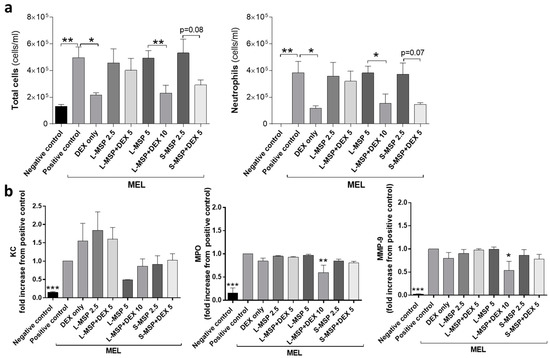 Both MEL- and LPS-exposure cause a neutrophilic inflammatory response in the lungs, and in the progression of the neutrophilic inflammatory response, MPO, KC, and MMP-9 are indicators of the activation and recruitment of neutrophils to the airways [37,38,39]. The results presented in Figure 2a reveal that the highest concentration of L-MSP loaded with DEX (L-MSP+DEX 10) provided a similar treatment effect to the MEL-induced lung inflammation, as a single aerosol of free DEX (5 mg/mL, “DEX only”). This was indicated by the reduced influx of neutrophils 24 h post exposure. Furthermore, the S-MSPs (S-MSP + DEX 5 mg/mL) reduced the cellular inflammation (p = 0.08) and neutrophils (p = 0.07) almost to the same degree, even though the administered amount of these particles carried only half of the amount DEX (2.5 mg/mL) compared to free DEX (5 mg/mL). As control groups, the HEPES buffer was administered either to the mice exposed to MEL/LPS (positive control), or to the healthy mice (negative control).