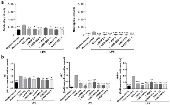 (a) Total leukocytes and the total number of neutrophils in bronchoalveolar fluid (BALF) and (b) analysis of KC, MPO, and MMP-9 in the BALF from the mice exposed to lipopolysaccharide (LPS). Values indicate means ± SEM; * p < 0.05, ** p < 0.01, *** p < 0.001 compared to the LPS group receiving vehicle. MSP—mesoporous silica particle (L: large, S: small); DEX—dexamethasone. Positive control: HEPES buffer administered to the mice exposed to MEL/LPS; negative control: HEPES buffer administered to healthy mice; DEX only: 5 mg/mL (free DEX/HEPES buffer). The numbers on the x-axis denote mg/mL (particles/HEPES buffer). Each bar represents a group of n = 6 animals.